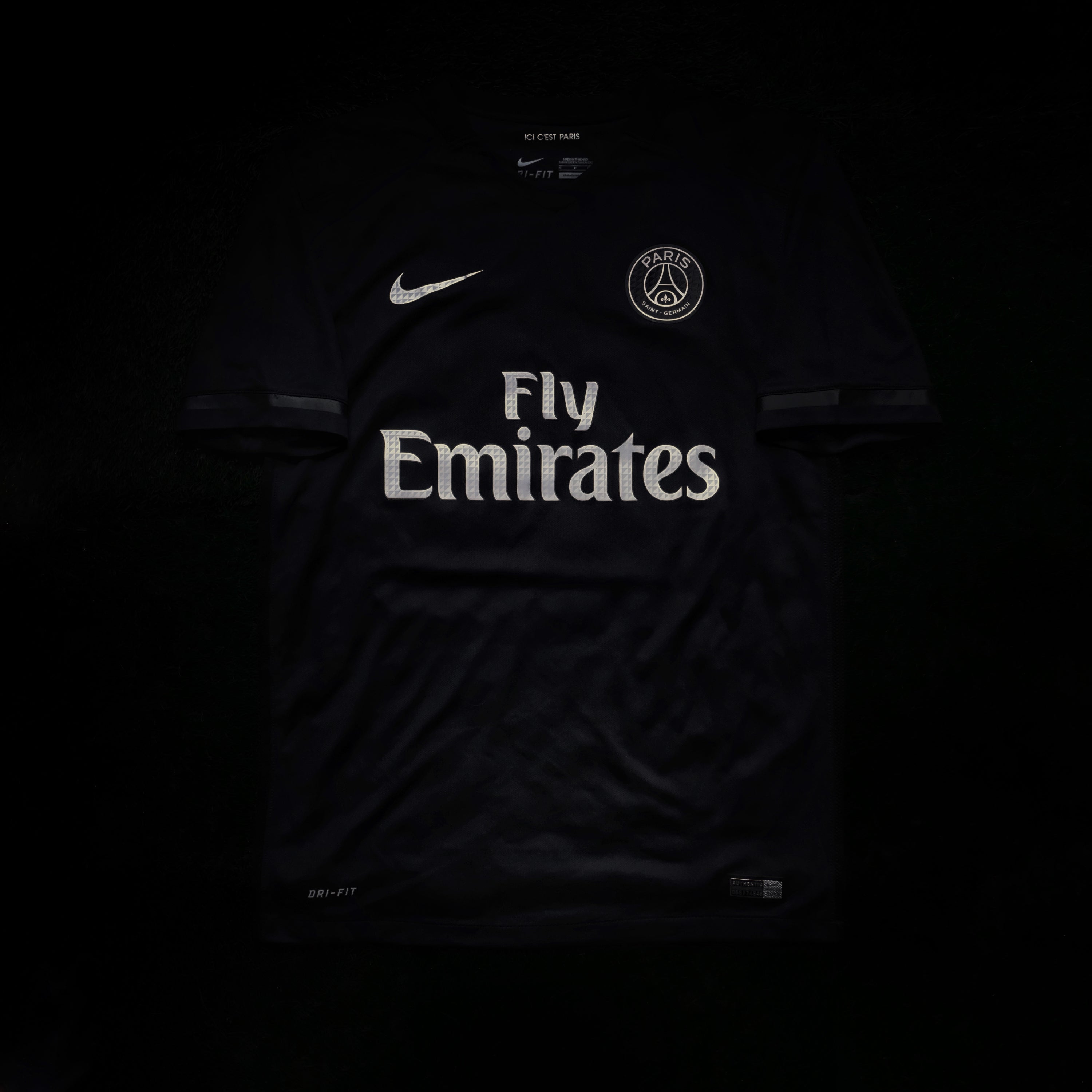 If the Juventus pink away is the face of football’s crossover with hip-hop and streetwear, PSG’s 2015-16 third kit is the blueprint for modern football minimalism. Part of Nike’s “Dark Light” concept, the shirt features a black base with subtly textured detailing, metallic-silver branding and numbers, and a shocking pink accent used for elements such as the player identification and ventilation details. The effect is almost sci-fi: a shirt that looks like futuristic armor under Champions League floodlights.